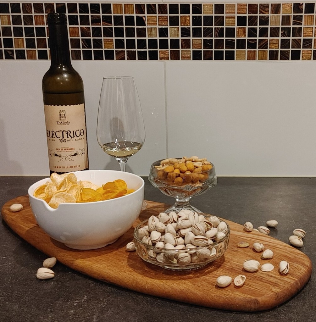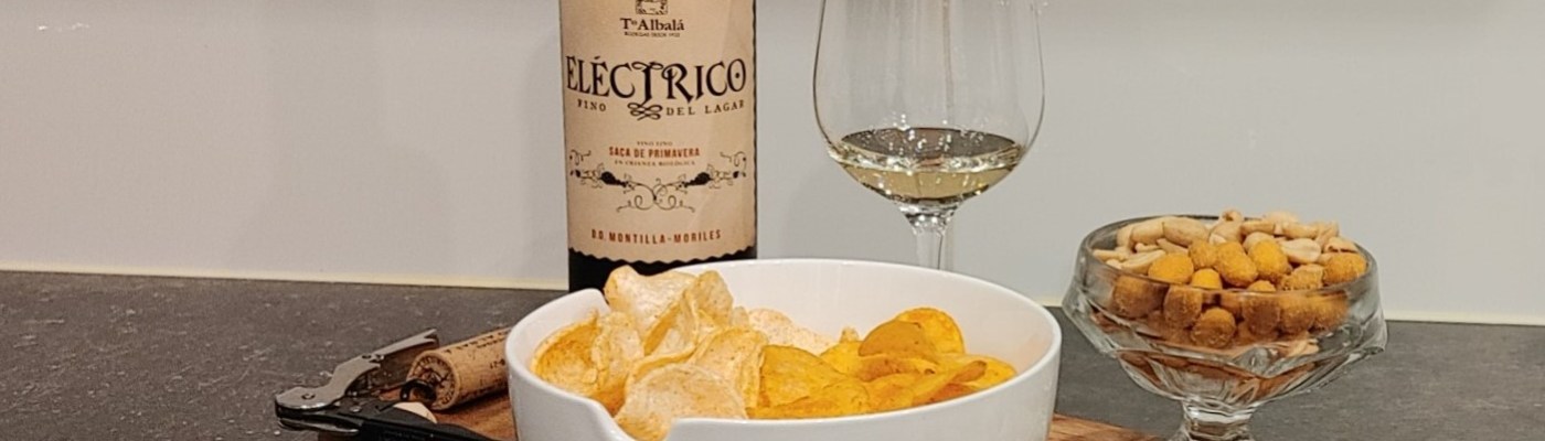 Wina, z położonej na południe od Kordoby, apelacji DO Montilla-Moriles znane są w Polsce raczej niewielu. Ja sam, chociaż czytałem o nich wielokrotnie, sięgnąłem po nie dotąd ledwie dwa lub trzy razy i zawsze były to tańsze etykiety. Tak jest i tym razem. Powstałe w 100% ze szczepu pedro ximenez, Bodegas Toro Albalá Eléctrico Fino del Lagar Montilla-Moriles DO kupimy w Polsce w cenie około 80zł za butelkę 500ml. Ja swoją nabyłem w sklepie Kondrat Wina Wybrane, w promocyjnej cenie 54zł. Czemu ją wybrałem? Z dwóch powodów. Pierwszym jest interesujący proces produkcyjny, mocno odróżniający je od większości win dostępnych na rynku. Co w nim niezwykłego? Przy starzeniu Eléctrico wykorzystuje się system zwany solera y criaderas. Jak on działa? Wyjaśniam w wielkim skrócie, gdyż w Internecie bez problemu można znaleźć dosyć wyczerpujące opisy. Beczki wypełnione winem piętruje się w kilku rzędach. Te położone na samym dole tworzą solera. Zawierają wino najstarsze, lub wręcz gotowe do butelkowania. Kolejne rzędy zwą się criaderas. Zgromadzone w nich beczki wypełnione są nie gotowym jeszcze winem, na różnych etapach starzenia. Co raz to młodszym w kolejnych rzędach, licząc od dołu. Butelkuje się wyłącznie zawartość beczek z poziomu solera, zawsze opróżniając je tylko częściowo. Następnie ubytek uzupełnia się winem z najniższego rzędu criaderas. Ten z kolei deficyt uzupełnia się zawartością beczek z następnego rzędu itd. Te najwyżej uzupełniane są winem pochodzącym z bieżącego zbioru. Poddane temu wieloletniemu procesowi kupażowania wino, zachowuje bardziej spójny charakter niż jego rocznikowi odpowiednicy, mocno zależni od zmiennych warunków w kolejnych sezonach. W tym miejscu można dodać, że system ten używany jest też min. przy starzeniu brandy oraz części win ze słynnej hiszpańskiej apelacji DO Jerez-Xérès-Sherry. Eléctrico leżakuje w ten sposób 10 lat. Czas ten spędza pod florem – płaszczem żywych drożdży unoszących się na powierzchni wina. Powstaje on samoczynnie i zabezpiecza trunek przed utlenieniem, jak również mocno wpływa na jego profil aromatyczny. W przeciwieństwie do win z Jerez, Eléctrico tak jak większość win z Montilla-Moriles nie zostało poddane procesowi wzmacniania, swoje 15% alkoholu zawdzięczając w całości fermentacji alkoholowej. Jak wspominałem był jeszcze drugi powód wyboru Eléctrico – notka o nim zamieszczona na stronie sklepu Marka Kondrata. Poleca je ona jako wino świetnie pasujące do różnego rodzaju słonych przekąsek w tym chipsów i orzeszków. Jako, że to guilty pleasure mojej narzeczonej, odwrotu nie było. Postanowiliśmy powiedzieć „sprawdzam”. Przygotowaliśmy chipsy ziemniaczane o smaku paprykowym, takoż przyprawione prażynki, solone pistacje oraz dwa rodzaje orzeszków ziemnych – solone i takie w chrupiącej pikantnej skorupce. W trakcie dorzuciliśmy jeszcze kilka fioletowych oliwek. Te ostatnie niestety nie załapały się do zdjęcia. Jak było? O tym poniżej.
