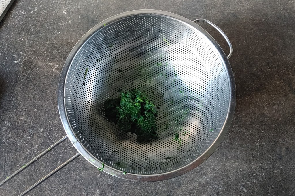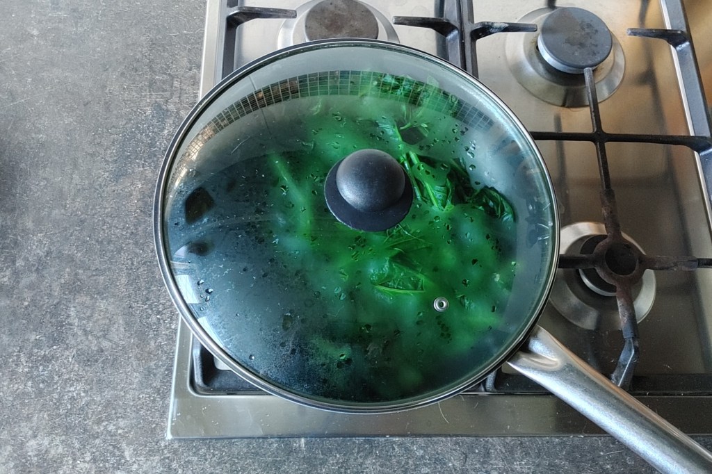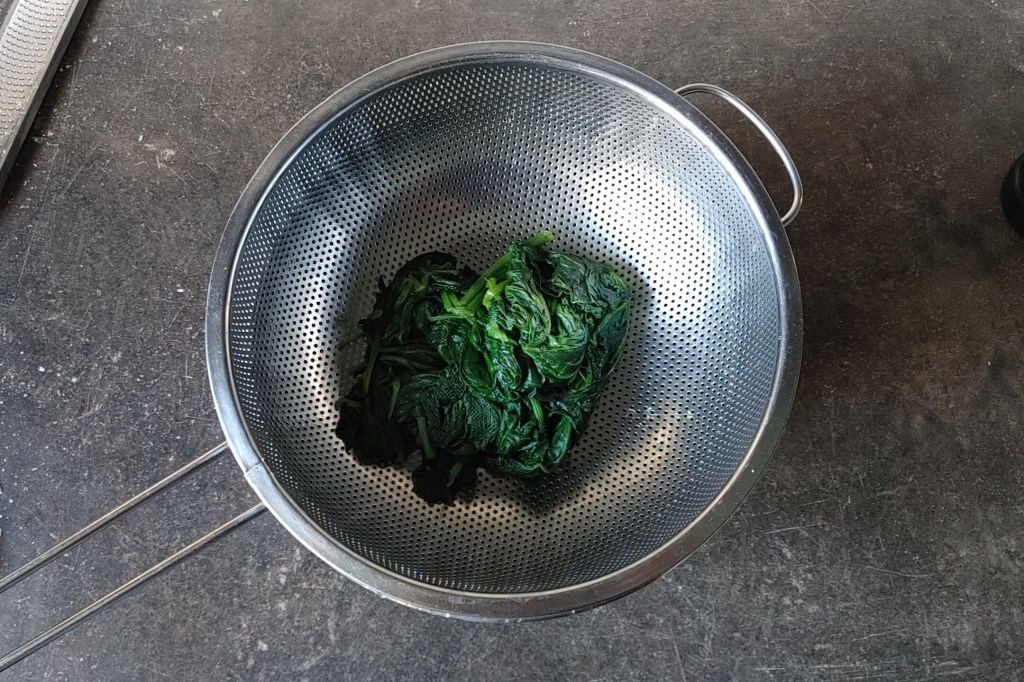 2. Szpinak dokładnie myjemy, a jeśli jego ogonki są łykowate – odrywamy je i wyrzucamy (warto sprawdzić to już na targu i ewentualnie kupić go więcej). Następnie listki zostawiamy na chwilę, żeby obciekły. Patelnię stawiamy na niewielkim ogniu i pozwalamy jej się nieco nagrzać. Wrzucamy na nią szpinak i przykrywamy pokrywką. Co jakiś czas mieszając, parujemy nasze warzywo aż stanie się całkowicie miękkie. Ugotowany szpinak przerzucamy na sitko i pozwalamy mu ostygnąć.