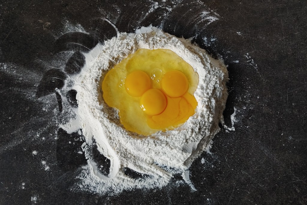 3. Teraz pora przygotować ciasto na makaron. Przepisy często podają, że na każde 100 gramów mąki potrzebujemy jednego jajka. To niestety dosyć duże uproszczenie. Jajko jaku nierówne, do tego dochodzi jeszcze wilgotność powietrza w trakcie zagniatania itp. Co za tym idzie, ilość potrzebnej mąki może znacznie odbiegać od przytoczonych proporcji. Jeśli dodamy jej za dużo, ciasto będzie twarde, ciężkie do rozwałkowania, nie będzie też chciało się lepić. Przesada w drugą stronę również nie jest wskazana. Miękkie i mokre ciasto będzie kleić się do dłoni utrudniając nadanie ravioli odpowiedniego kształtu. Co zatem zrobić? Przede wszystkim nie tracić głowy i obserwować ciasto w trakcie wyrabiania. Najpierw mąka. Odmierzamy 150 gramów i przesypujemy do średniej wielkości miski (możemy zrobić „studnię” z mąki bezpośrednio na powierzchni roboczej, jest to jednak metoda trudniejsza). W powstałym kopczyku robimy zagłębienie, w które wbijamy dwa jaja. Teraz widelcem energicznie ubijamy masę jajeczną. Kiedy białko i żółtko dobrze się połączą, mieszamy dalej, co kilka ruchów zabierając wraz z nimi odrobinę mąki. Postępujemy w ten sposób do momentu, w którym wszystkie składniki wstępnie się połączą. Teraz nasze ciasto przerzucamy na stolnicę, dużą deskę lub blat (kamienny się do tego nie nadaje – schłodzi ciasto, które w efekcie stanie się twarde) i zaczynamy wyrabiać. Po pierwszych ruchach oceniamy konsystencję. Na tym etapie ciasto powinno być jeszcze dosyć lepkie. Jeśli jednak widzimy, że jest bardzo wilgotne i nie da się go wyrabiać, dodajemy odrobinę z odłożonej wcześniej mąki. Chwilę wyrabiamy i ewentualnie dodajemy jeszcze odrobinę. Proces możemy powtórzyć wielokrotnie, uważajmy jednak żeby nie przesadzić (gotowe ciasto będzie znacznie mniej lepkie niż początkowo). Ciasto wyrabiamy około 10 minut, aż będzie gładkie i elastyczne. Musi dosyć łatwo uformować się w kulę. Naciśnięte palcem powinno wgnieść się z lekkim oporem, a następnie wrócić do stanu pierwotnego. Gotowe ciasto przykrywamy miską, żeby nie wyschło i przechodzimy do następnego etapu.