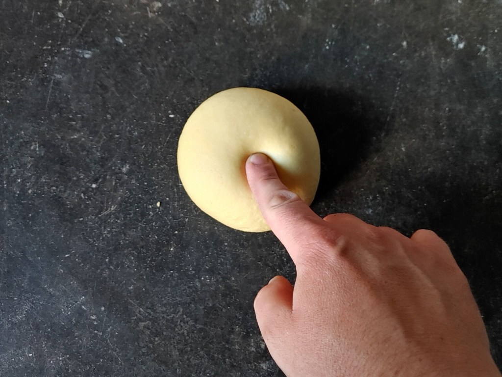5. Wracamy do ciasta. Powinno odpoczywać od pół godziny do godziny. Jeśli nie jesteśmy pewni czy jest gotowe do dalszej pracy – nagniatamy je palcem. Tym razem ciasto nie powinno wrócić do pierwotnej formy. Teraz czeka nas nieco pracy – musimy je rozwałkować. Spłaszczamy kulkę dłonią i posypujemy mąką z obu stron. Zaczynamy wałkować. Kilka ruchów w przód i tył, po czym obracamy ciasto o dziewięćdziesiąt stopni w prawo. Kilka ruchów i znowu kolejna zmiana pozycji w tę samą stronę. Powtarzamy ten proces wielokrotnie. Dbamy by ciasto było równomiernie rozwałkowane, a w kształcie zbliżone do koła. Dobrze jeśli powierzchnia na której pracujemy wykonana jest z drewna – zapobiega to przyklejaniu się (na laminowanym blacie będziemy musieli użyć nieco więcej mąki). W razie potrzeby lekko podsypujemy ciasto mąką, pilnując jednak by wierzchnia strona pozostała w miarę możliwości „czysta” (bez warstwy mąki). Powinniśmy rozwałkować ciasto dosyć cienko, jednak nie tak, żeby było widać przez nie cały świat. Jeśli nie jesteśmy pewni, zróbmy test wsuwając pod nie rękę. Jeśli dokładnie widzimy jej zarys, jednak bez wyraźnych szczegółów, możemy uznać że jest gotowe. Uff! Wraz z nabieraniem doświadczenia będzie nam łatwiej ocenić, czy grubość ciasta jest odpowiednia.