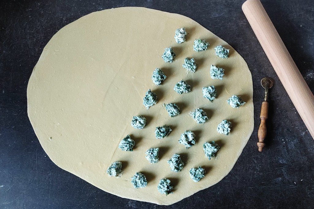 7. Szybko wracamy do ciasta, nie możemy pozwolić mu wyschnąć. Poza tym czeka nas wielka chwila, czas na uformowanie naszych ravioli. Upewniamy się, że rozwałkowane ciasto nie klei się do powierzchni roboczej i ewentualnie podsypujemy je mąką (nie posypujemy z wierzchu). Warto też zwrócić uwagę czy powierzchnia, na której pracujemy jest odporna na działanie ostrymi narzędziami (będziemy na niej wykrawać ravioli). Rozwałkowane ciasto składamy na pół, tak by brzegi obu stron dosyć dokładnie się pokrywały (jeśli wszystko zrobiliśmy dobrze, ciasto nie powinno się kleić). Lekko zaprasowujemy powstałe zagięcie i ponownie rozkładamy. Zaczynając od wyznaczonej w ten sposób linii, w równych rzędach, przy użyciu dwóch łyżek nakładamy nadzienie. Wielkość jednej porcji farszu to u mnie mniej więcej wielkość dużej czereśni. Odstępy między grudkami nadzienia powinny wynosić około trzech centymetrów (w miarę nabywania umiejętności ta odległość może się odrobinę zmniejszyć). Kiedy cały farsz zostanie rozdysponowany, delikatnie ponownie składamy ciasto na pół, dbając by jego krawędzie do siebie pasowały. Jeśli zobaczymy, że podczas wałkowania ciasto zanadto nam przeschło, warto przed jego złożeniem lekko zwilżyć przerwy pomiędzy nałożonym nadzieniem. Nie przesadzajmy z tym jednak – wystarczy lekko wilgotny palec.