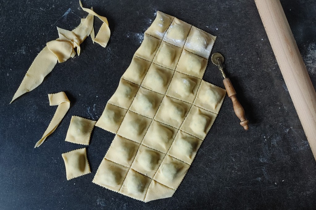 Dotarliśmy do najtrudniejszej części, musimy skleić krawędzie naszych ravioli. Ja zawsze robię to kantem dłoni (metod jest wiele, niektórzy używają tutaj np. brzegu talerza). Ugniatamy widoczne między porcjami nadzienia ciasto, starając się jednocześnie pozbyć jak najwięcej powietrza z naszych „pierożków” (uwaga: nie naciskajmy samych wybrzuszeń z farszem!). Cały proces zaczynamy od rzędów prostopadłych do pierwotnego miejsca złożenia ciasta. Kiedy wszystkie są już sklejone, przechodzimy do tych równoległych. Tym razem zaczynamy od rzędu najbliższego miejscu złożenia, a następnie przesuwamy się w kierunku zewnętrznym. Kiedy wszystkie przestrzenie między naszymi ravioli są już sklejone, możemy przystąpić do ich wykrojenia. Najłatwiej zrobić to przy pomocy radełka do ciasta. Jeśli nie dysponujemy takim przyrządem, możemy użyć też zwykłego noża lub noża do pizzy (stąd moja wcześniejsza uwaga o odporności blatu na działanie ostrych narzędzi). Brzegi wyciętego ravioli nie powinny być zbyt obszerne – w razie potrzeby możemy je lekko okroić. W tym miejscu warto upewnić się czy nasze ravioli dobrze się skleiły. Jeśli stwierdzimy że nie, możemy dodatkowo docisnąć brzegi końcami zębów widelca. Wycięte ravioli układamy na oprószonej mąką desce lub bawełnianej ściereczce, pilnując by się nie dotykały. Jeśli nie planujemy gotować ich od razu, przykrywamy drugą ściereczką.