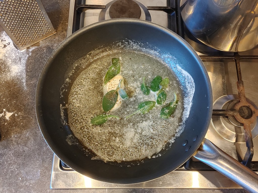 8. W momencie, w którym skończyliśmy formować nasze ravioli, woda powinna się już zagotować. Dodajemy do niej czubatą łyżkę soli i odczekujemy chwilę, aż w garnku ponownie zacznie wrzeć. W tym czasie stawiamy na średnim gazie patelnię i nakładamy na nią masło, szałwię i dużą szczyptę świeżo zmielonego pieprzu. Smażymy minutę lub dwie, pilnując by masło się nie przypaliło. Wyłączamy gaz pod patelnią. Teraz partiami wrzucamy nasze „pierożki” do garnka. Lekko mieszamy. Każda partia powinna gotować się około pięciu minut. Po tym czasie próbujemy. Jeśli brzegi ciasta dalej są lekko twarde, pozwalamy ravioli gotować się jeszcze minutę. Znowu próbujemy i ewentualnie dajemy im jeszcze chwilę. Ravioli są gotowe, gdy makaron zmięknie, jednocześnie pozostając jędrnym. Przerzucamy je na gorące masło z szałwią, dodajemy dwie-trzy łyżki wody od gotowania makaronu i potrząsamy patelnią (jeśli potrafimy, możemy też podrzucać zawartość patelni), aż sos stanie się kremowy i dokładnie wszystko pokryje. Jeśli uznamy, że są one niewystarczająco omaszczone, dodajemy jeszcze trochę masła i znowu mieszamy.