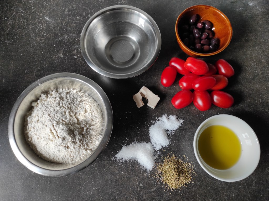 Wiemy już czego potrzebujemy, należy jednak powiedzieć kilka słów na temat wymienionych składników. Zacznijmy od kwestii fundamentalnej, czyli od mąki. Dobór tej odpowiedniej ma kluczowe znaczenie. Nasze ciasto nie będzie dojrzewać bardzo długo, musimy więc poszukać mąki o niezbyt wysokim indeksie „W” (siła mąki wpływająca na długość rośnięcia ciasta i możliwą do uzyskania hydrację). Większość oryginalnych przepisów woła o „zwykłą” mąkę typu „00”. Co to znaczy? Jest to mąka o bardzo drobnym przemiale („00”), przeznaczona do ciast o krótkim czasie wzrostu („zwykła”). Ze swojej strony polecałbym tutaj Caputo Doppio Zero i Le 5 Stagioni Tipo „00” Classica. Ja, na potrzeby tego przepisu korzystałem jednak z mąki Caputo Tipo „0” Nuvola. „Zerówka” to mąką o nieco grubszym przemiale, a w tym konkretnym wypadku również o wyższym indeksie „W” – przeznaczona jest więc do nieco dłuższego dojrzewania. Odpowiednią mąkę bez problemu kupicie w Internecie, np. poprzez serwis Allegro, lub w stacjonarnych sklepach ze zdrową żywnością. Ja swoją kupiłem w łódzkim sklepie Słoneczko. Bardzo ważne są również pomidory. Świeże owoce będą tu najlepszym wyborem. Szukamy takich o zwartym, suchym miąższu. Sprawdzą się odmiany san marzano, roma lub bawole serce. Dobre pomidory kiściowe również powinny dać radę. Po sezonie spróbowałbym puszkowanych pomidorów daktylowych lub san marzano, uprzednio odsączonych z zalewy. W sprawie wyboru odpowiedniej marki odsyłam do jednego z moich poprzednich wpisów. Ja skorzystałem z własnoręcznie wyhodowanych pomidorów san marzano. Warto poszukać dobrych oliwek. Oryginalne przepisy nie są zgodne co do ich koloru. Ja zwykle używam fioletowych. Dostępność włoskich oliwek w Polsce jest umiarkowana, dlatego polecam oliwki greckiej odmiany kalamata. Wybierając je, zwracajmy uwagę czy owoce są w całości i nie wyglądają na miękkie (podglądamy przez szkło). Zawsze lepiej wybrać te z pestką. Zachowują one lepszą konsystencje oraz więcej smaku świeżego owocu. Polecam oliwki kalamata marki Neféli – dostępne w Internecie, a w Łodzi w sieci sklepów Słoneczko. Ważna jest też dobra oliwa. Zwykle używam marki Levante. Tym razem używałem jednak przyzwoitej i niedrogiej oliwy Cadel Monte, również kupionej w łódzkim Słoneczku. Jeśli zamierzacie szukać czegoś innego, upewnijcie się że produkt nie jest mieszanką różnych oliw. Smak i aromat powinny być świeże i pełne nut roślinnych. Zawsze korzystam ze świeżych drożdży. Jeśli mamy jakieś w domu, upewniamy się że nie są wyschnięte. W razie wątpliwości lepiej kupić świeżą paczkę. Tę samą zasadę zastosujmy w kwestii oregano – najlepiej, żeby pochodziło ze świeżo otwartej paczki.