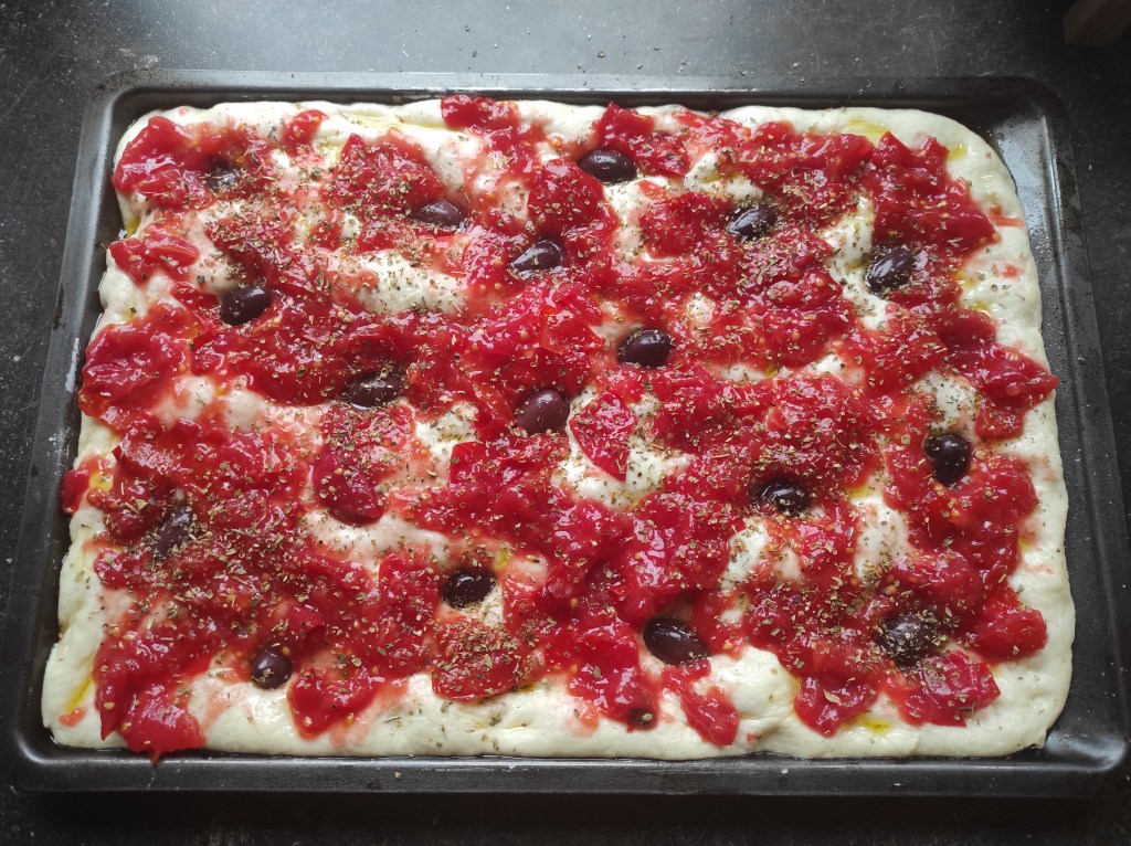 3. Kiedy pierwszy półgodzinny odpoczynek zbliża się do końca, przygotowujemy pomidory (nie róbcie tego za wcześnie, bo pomidory puszczą sok i stracą jędrność). Przerzucamy je do miski i kruszymy w dłoniach na niewielkie kawałki (możemy wcześniej pokroić je na połówki, żeby sok nas nie opryskał). Nie starajmy się zrobić z owoców jednolitej masy. Kiedy minie pierwsze pół godziny, pokruszone pomidory rozrzucamy na wierzchu focacci. Staramy się, by nie pokrywały ściśle każdego centymetra (spójrzcie jak wygląda to na zdjęciu). Pozostawiona przez nas wolna przestrzeń pozwoli ciastu nabrać więcej chrupkości, a skumulowane w pewnych miejscach pomidory będą miały mniejszą tendencję do wysychania w piekarniku. Teraz pora na oliwki. Rozkładamy je mniej więcej równomiernie, każdą wciskając palcem w wyrastające ciasto. Na koniec wierzch focacci posypujemy do smaku solą i oregano (nie przesadźmy). Teraz pora na drugą półgodzinną drzemkę.
