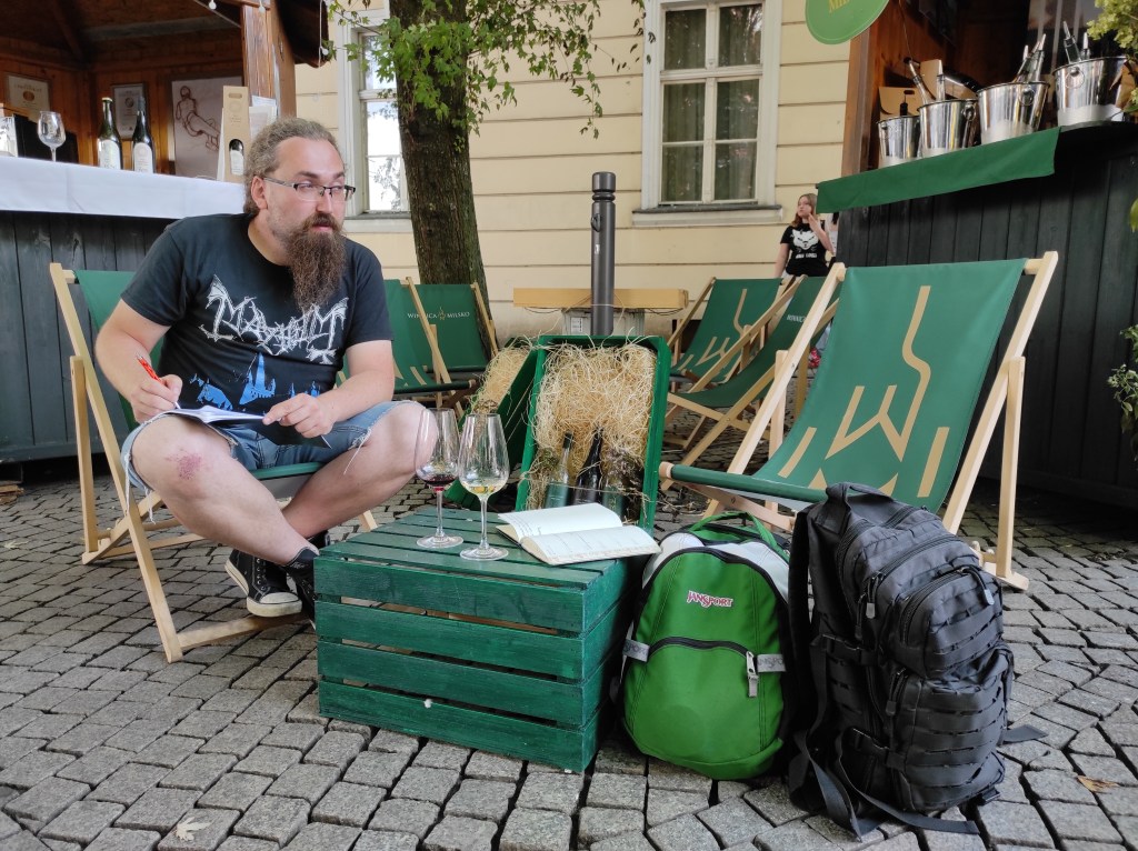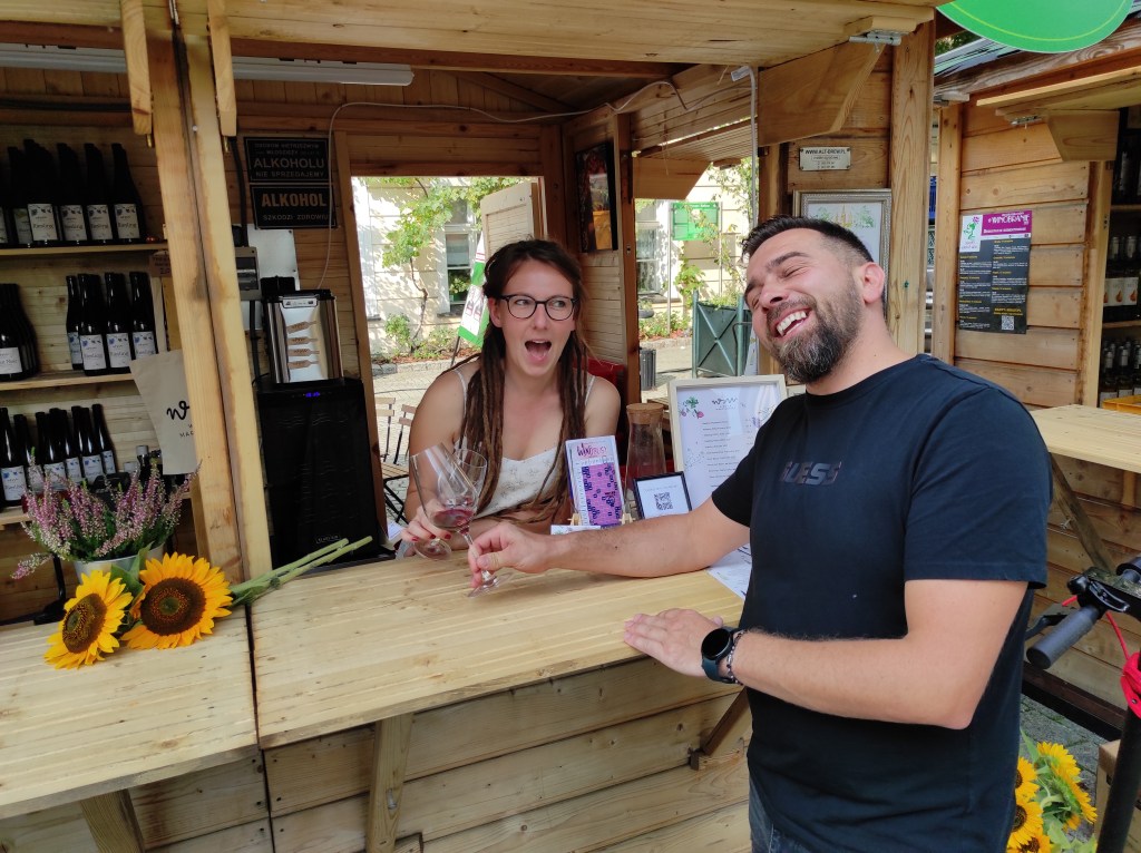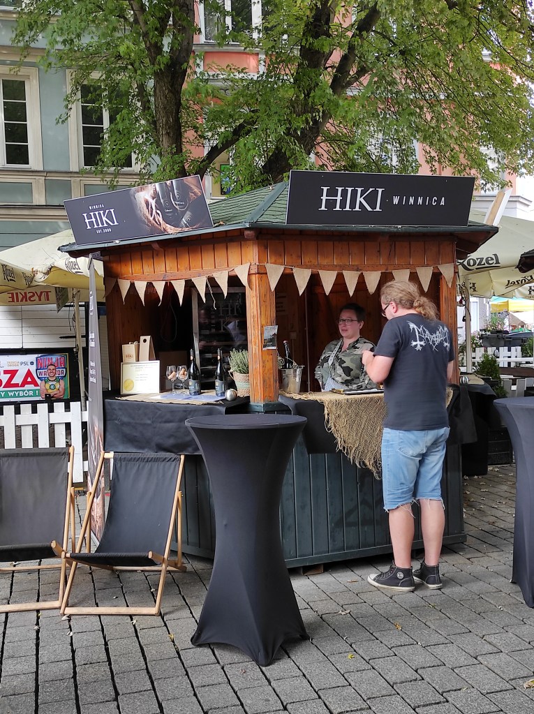 Zdecydowanie mniejszy kontakt mieliśmy z innymi uczestnikami imprezy. Tak jak w poprzednich latach, aż do późnych godzin popołudniowych na Winobraniu nie było tłumów. Goście pojawiali się raczej pojedynczo, czasami widać było członków jakiejś zorganizowanej wycieczki. Chociaż wiele osób było tu specjalnie dla lubuskiego wina, to jednak dosyć często dało się też słyszeć zaskoczenie obecnością miejscowych winiarzy. Niestety, o ile w roku poprzednim uznaliśmy, że podejście ludzi do wina powoli się zmienia, to podczas tegorocznej edycji wszystko wróciło do „normy”. Znaczna część odwiedzających podchodziła do budek z dziwnym lękiem lub przynajmniej rezerwą. Zachęcani przez winiarzy do darmowej degustacji, często rezygnowali z niej w ogóle i wycofywali się rakiem. Ten nabożny lęk przed winem pozostaje dla mnie zupełnie niezrozumiały. Ponownie też masowo pojawiło się, znane nam z sezonu 2021, pytanie o „słodkie wineczko” czy wspomniane wcześniej „wino czekoladowe”. Mniej w tym roku widziałem także osób, które sporządzały podczas degustacji notatki lub dyskutowały z wystawcami na temat technikaliów (przypominam, że spędziliśmy w tym roku znacznie więcej czasu bezpośrednio przy stoiskach wystawców). Zastanawiam się czy część z tej bardziej świadomej grupy nie porzuciła Winobrania dla Dni Otwartych Piwnic Winiarskich czy organizowanych w Krośnie Odrzańskim Muśniętych. Od czasu do czasu na Starym Rynku pojawiał się ktoś, kto przechodząc postanowił kupić butelkę czy dwie. Większość z tych osób mniej lub bardziej wiedziała czego szuka, zwykle padały pytania o znane już etykiety lub też takie polecone przez kogoś znajomego.