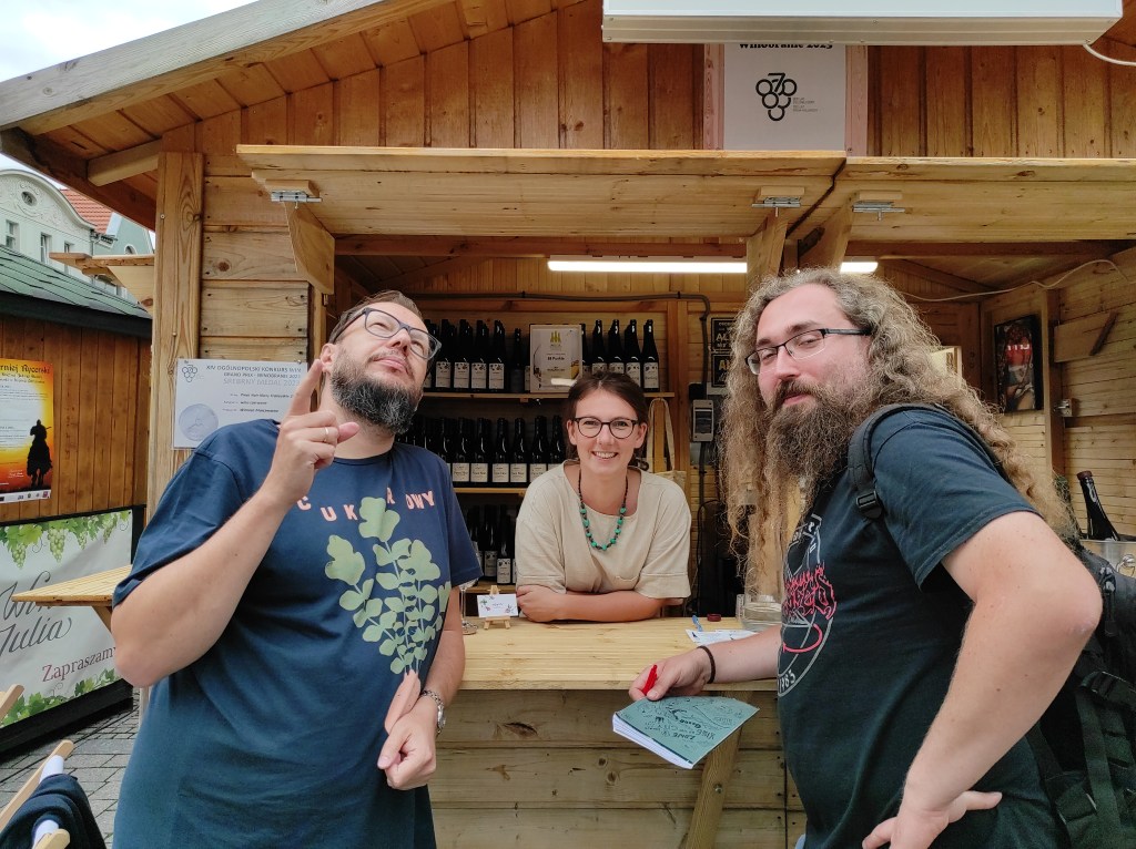 No dobrze. Ponarzekałem trochę, teraz przejdźmy do przyjemniejszej części. Chciałbym powiedzieć kilka słów o ludziach, których spotkaliśmy podczas Winobrania. Z naszej perspektywy oczywiście najbardziej istotni byli winiarze i to głównie z nimi wchodziliśmy w interakcje. Przez te kilka sezonów zdążyliśmy już dosyć dobrze zapoznać znaczną część z miejscowych producentów i na Winobraniu czujemy się prawie jak u siebie. Chociaż w tym roku odbyliśmy jeszcze więcej rozmów z jeszcze większą liczbą osób niż w roku poprzednim, to jednak nadal nie udało nam się odwiedzić wszystkich wystawców. Spodziewam się, że z roku na rok będzie o to tylko trudniej ze względu na ciągle wzrastającą frekwencję. Pomimo tego, że kilka winnic w ostatnich latach zrezygnowało z udziału w imprezie (szkoda mi szczególnie Winnicy Adam Płoński), Winobranie zanotowało w tym roku kolejny rekord, goszcząc czterdziestu dwóch wystawców. Poskutkowało to wieloma nowymi twarzami, czy to producentów, czy ich pracowników. W tym miejscu warto podkreślić, że zdecydowana większość winiarzy zdecydowała się uczestniczyć w wydarzeniu osobiście. To bardzo ważne, gdyż nawet najlepszy pracownik (tu chciałbym jednak pochwalić chłopaków z Winnicy Saganum, którzy byli naprawdę dobrze zorientowani w portfolio pracodawcy) nie opowie o prezentowanym winie tyle co jego stwórca, a większość winiarzy opowiadała dużo i chętnie. Na palcach jednej ręki policzyłbym ludzi, z którymi nie mogliśmy złapać wspólnego języka. Wiele czasu spędziliśmy zatem na dyskusjach i dowiedzieliśmy się masy nowych rzeczy. Za wszystkie interesujące rozmowy bardzo Wam dziękujemy!