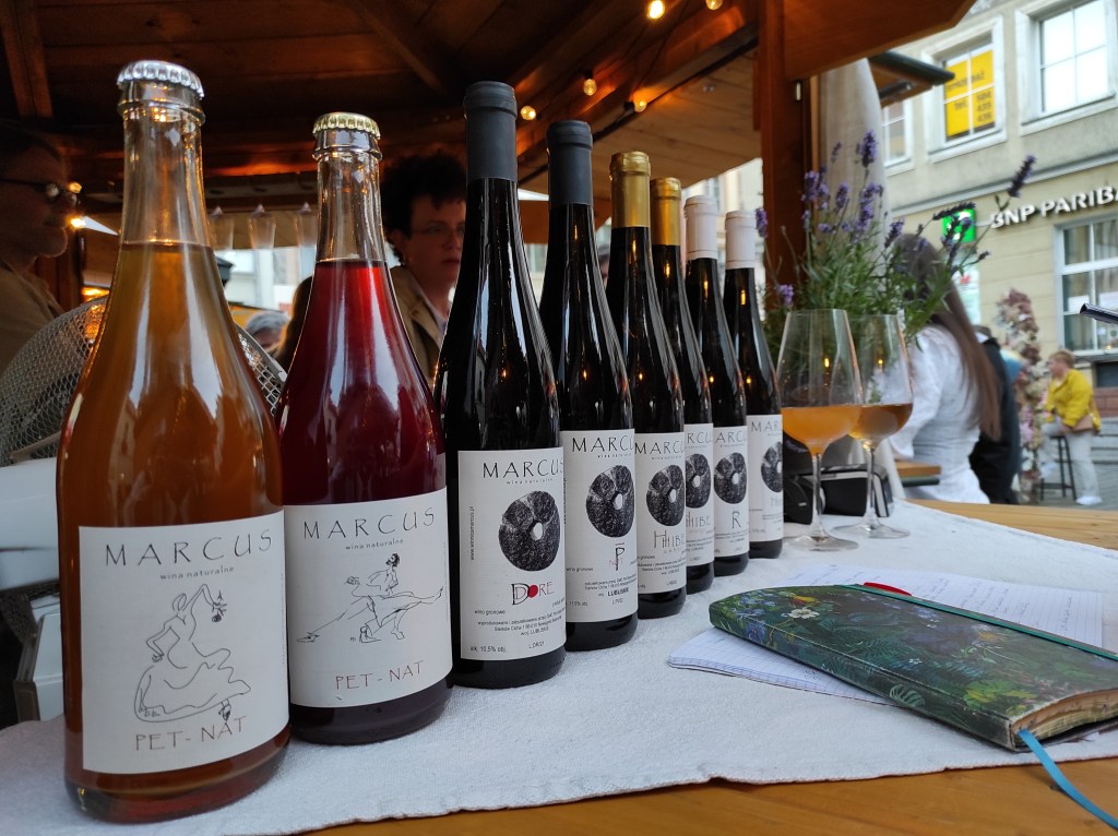 Na koniec pozostały nam wina pomarańczowe oraz wszelkiej maści pét-naty. Muszę przyznać, że te dwie kategorie niezbyt często goszczą w moim kieliszku i nie mam na ich temat wielkiej wiedzy. Powodem tego prawdopodobnie jest fakt, że próbowałem głównie win produkowanych w Polsce, gdzie bądź co bądź dopiero wyszły one z niemowlęctwa. Niemniej, nie mogę nie odnotować, że z roku na rok na Winobraniu pojawia się coraz więcej tego typu win oraz że w mojej ocenie smakują one coraz lepiej. Jeszcze w zeszłym sezonie naprawdę ciężko byłoby mi wyróżnić jakąś butelkę (większość win miała mniejsze lub większe niedostatki – za niską kwasowość, małą aromatyczność, nieczyste nuty etc.). Podczas ostatniej edycji kilka win wypiłem jednak z prawdziwą przyjemnością. Jednym z nich był na pewno Pét-nat 2022 (3,7/5) z Winnicy Saint Vincent – pełen truskawek i malin, mocno orzeźwiający z długo utrzymującym się musowaniem. Smakował mi także pochodzący z Winnicy Folwark Pszczew Forange 2021 (3,7/5), kwasowy, pachnący żółtymi jabłkami i kandyzowanymi skórkami cytrusów. Mówiąc o winach naturalnych, nie sposób nie wymienić Winnicy Marcus, w ofercie której znajdziemy ich zdecydowanie najwięcej. Spróbowaliśmy wszystkich. Najbardziej podobały mi się: mocno zbudowany Pét-nat Orange 2022 (3,8/5), pełen żółtych jabłek, jabłkowych pestek i cytrusowych skórek, oraz, dosyć łagodny jak na wino pomarańczowe, Hibe Amber 2021 (3,8/5) – pachnący, jabłkami, ziołami i żywicą.