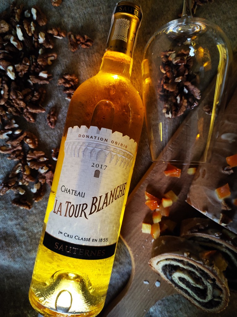 Wina próbowaliśmy przede wszystkim w towarzystwie domowych ciast, piernika i makowca. Chociaż w obu przypadkach sprawdzało się dobrze, wyróżnić muszę ten drugi wypiek. Sauterens zadziałał tu jak wzmacniacz smaku, wspaniale podkreślając bogactwo makowca, wyciągając na wierzch aromaty cytrusów, orzechów, maku i miodu. Niestety nie dysponowałem nawet kawałkiem sera z przerostem niebieskiej pleśni, który z pewnością świetnie odnalazłby się w towarzystwie omawianego wina. Na pewno możecie podać je także do kaczki, pasztetu z gęsimi wątróbkami lub sernika. My wykonaliśmy jeszcze krótki test, próbując La Tour Blanche do, prócz ciast, kilku rzeczy które akurat mieliśmy w domu. Spróbowaliśmy dwóch rodzajów orzechów arachidowych – lekko pikantnych w chrupiącej panierce oraz takich z miodową polewą, pikantnego salami – ventricina oraz serów: pecorino romano i fontal. Wino zdecydowanie najlepiej wypadło w połączeniu ze słonym owczym serem, lekko podbijając odzwierzęce aromaty i jednocześnie łagodząc jego smak. Dalej wymieniłbym pikantne orzechy arachidowe i salami. Słodkie wino przyjemnie łagodziło ostrość obu, nie mogę jednak powiedzieć, żebyśmy mieli do czynienia z jakąś wartością dodaną. Najgorzej wypadły orzeszki w miodowej polewie i łagodny fontal. Oba utonęły w słodyczy Sauternesa, stając się ledwo wyczuwalnymi. 4,2/5
