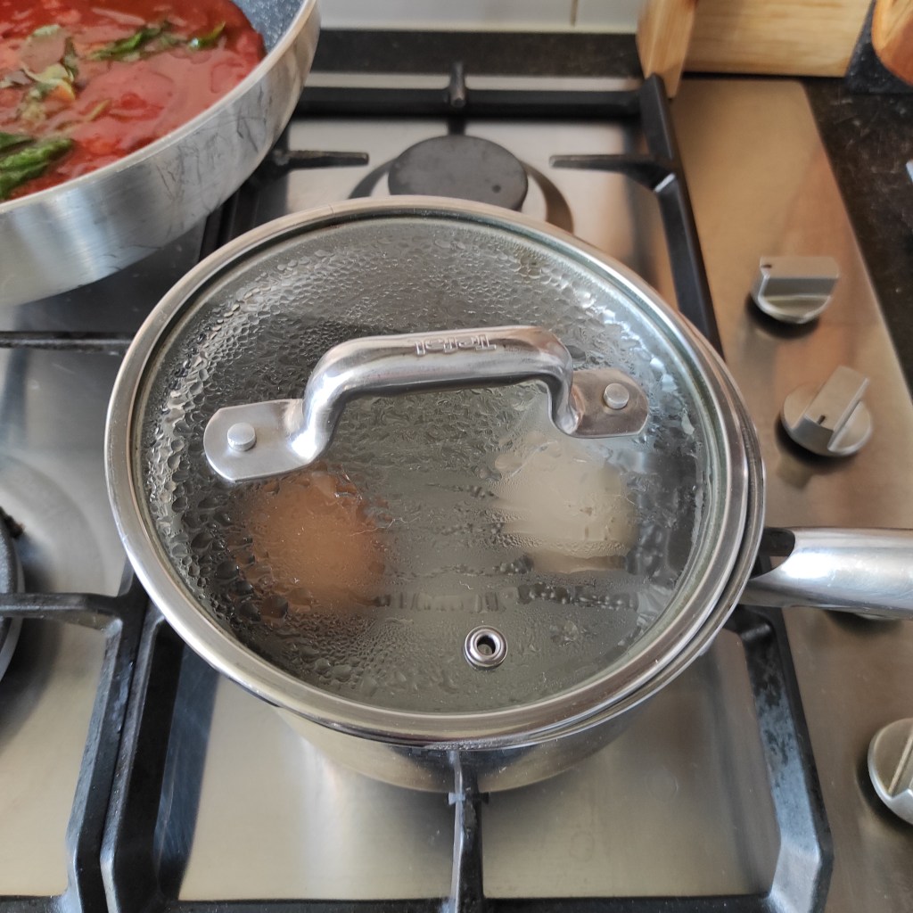 3. Kiedy sos pomidorowy się gotuje, pora przygotować makaron. Do dużego garnka nalewamy 3 litry wody i całość ustawiamy na średnim gazie. Kiedy ta zacznie wrzeć, dodajemy czubatą łyżkę soli morskiej, a następnie zaglądamy do sosu. Jeśli widzimy, że jest już prawie gotowy, dorzucamy do wody makaron. Jeśli sos potrzebuje jeszcze czasu, poczekajmy chwilę z gotowaniem pasty. Makaron gotujemy na półtwardo (podzielmy czas jaki widnieje na opakowaniu na dwa i dodajmy minutę). Po tym czasie próbujemy. Powinien on zmięknąć, zachowując jednak we wnętrzu wyraźny twardy rdzeń. Odcedzamy, pozostawiając kubek wody w której się gotował. Makaron od razu dorzucamy do sosu, który w tym samym czasie powinien być już gotowy. Dodajemy jajkosalami, a następnie mieszamy wszystko ze sobą. Makaron musi być dokładnie oblepiony sosem, jednak całość powinna pozostać odrobinę luźna. Jeśli danie jest zbyt gęste, dolejmy odrobinę wody, w której gotował się makaron i jeszcze raz zamieszajmy całość. Wyłączamy gaz pod patelnią.
