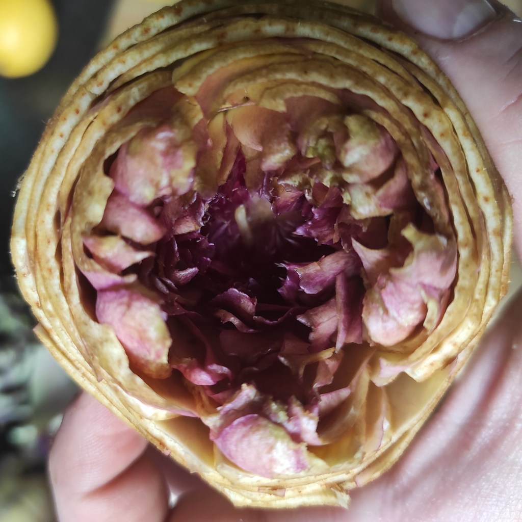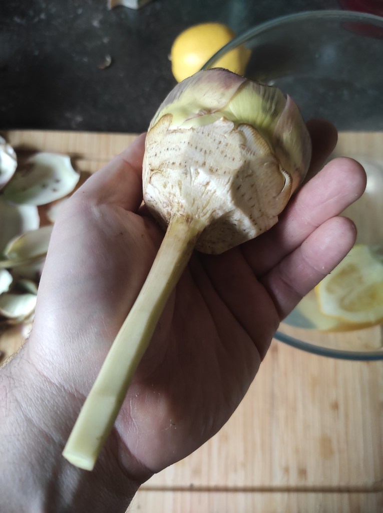 2. Teraz pora na najtrudniejszy etap czyli obieranie. Zaczynamy odrywać zewnętrzne płatki, po kolei, aż zobaczymy takie o jasnym, żółtym lub żółtozielonym kolorze. Do tego momentu nasz karczoch, jeśli był dobrej jakości, schudnie niemal o połowę. Teraz pora skrócić pozostałą część kwiatu, przycinając go od strony wierzchołka o około 2/5. Najlepiej ciąć pod lekkim kątem (we Włoszech często tnie się specjalnym spiralnym ruchem, ja jednak nie posiadłem jeszcze tej sztuki), tak by wewnętrzne płatki pozostały nieco dłuższe. Jeśli brak nam doświadczenia, w trakcie przycinania płatków warto spróbować kawałka jednego z nich. Jeśli jest twardy i zdrewniały, musimy ciąć nieco radykalniej, jeśli nie – zostawiamy tak, jak jest. Pamiętajmy o metodzie małych kroków – lepiej uciąć za mało (i poprawić) niż za dużo. Teraz pora zająć się wnętrzem kielicha. Rozchylamy palcami płatki, pilnując by nie rozerwać kwiatu. Wkładamy do środka małą łyżeczkę, nóż do masła lub płaski trzonek sztućca i kolistymi ruchami skrobiemy dno pozbywając się słupków i pręcików, a także najbardziej wewnętrznych, twardych płatków. W trakcie całego procesu sprawdzamy palcem czy odpowiednio oczyściliśmy wnętrze karczocha. Jeśli czujemy coś twardego lub ostrego, usuwamy to. Nie skrobiemy zbyt głęboko, by nie uszkodzić samego dna kielicha, zwykle uważanego za najbardziej wartościową cześć kwiatu (to tzw. serce karczocha). Najtrudniejsze za nami! Teraz obieramy zewnętrzną cześć dna kwiatowego. Ostrym nożem skrawamy całą jego powierzchnię wraz z miejscami skąd wyrastały oberwane wcześniej płatki. Usuwamy wszystkie zdrewniałe części, pilnując jednak by nie obierać za grubo. W razie wątpliwości spróbujmy odciętego kawałka i upewnijmy się, że nie trzeba poprawek. Kiedy dno kwiatowe jest oczyszczone, przechodzimy do ostatniej części czyli łodygi (czasami zapominam i obieram ją na początku, co zwykle kończy się jej złamaniem w trakcie dalszych prac). Skracamy ją, przycinając na około 5 centymetrów. Następnie ostrym nożykiem obieramy ze zdrewniałej skórki, pozostawiając jedynie biały rdzeń (poniżej znajdziecie zdjęcie częściowo obranej łodygi, dla porównania kolorów). Pierwszy karczoch jest obrany. Teraz cały proces powtarzamy dla pozostałych. W trakcie całego procesu obierania miejsca cięć jak najszybciej nacieramy sokiem z cytryny. Jeśli tego zaniechamy, nasze karczochy sczernieją i staną się niezbyt apetyczne. Obrany kwiat wrzucamy do miski z wodą i sokiem cytrynowym, gdzie poczeka na dalszy etap prac.