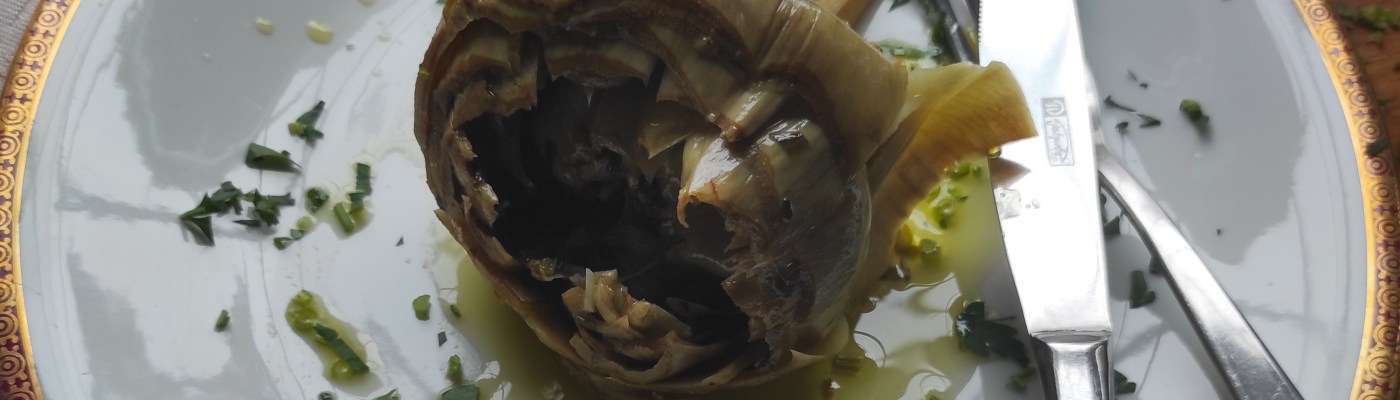 Moje podejście zmieniło się dopiero podczas wizyty w Rzymie, będącej jednocześnie naszą pierwszą podróżą do Włoch w ogóle. Tuż przy znajdującym się od strony Via del Porto Fluviale wejściu do naszego domu umiejscowiony był duży warzywniak prowadzony przez egipskich imigrantów. W poustawianych piętrowo skrzynkach pyszniły się karczochy różnych odmian i kalibrów. Myśl, by coś z nich przyrządzić, pojawiła się w mojej głowie niemal natychmiast. Sporą cześć wieczoru spędziłem poszukując odpowiedniego przepisu. Padło na recepturę na carciofi alla romana z polskojęzycznego, acz nagrywanego z udziałem rodowitej Włoszki, sympatycznego youtube’owego kanału pt. Kuchnia u Anny (później korzystałem z niego jeszcze wielokrotnie 😉). Już następnego dnia, z samego rana nabyłem kilka cytryn, pęczek świeżej pietruszki i mięty oraz piękny bukiet dorodnych karczochów. Chociaż obieranie ich zabrało mi nieco czasu, samo danie wyszło bardziej niż poprawnie, co zachęciło do powtórzenia go jeszcze raz podczas tego samego wyjazdu. Smak okazał się dosyć swojski, nawiązujący nieco do innych zielonych warzyw, takich jak szparagi, brokuł czy brukselka. Tym samym karczochy zostały odczarowane, a burżuazyjna łatka zniknęła.