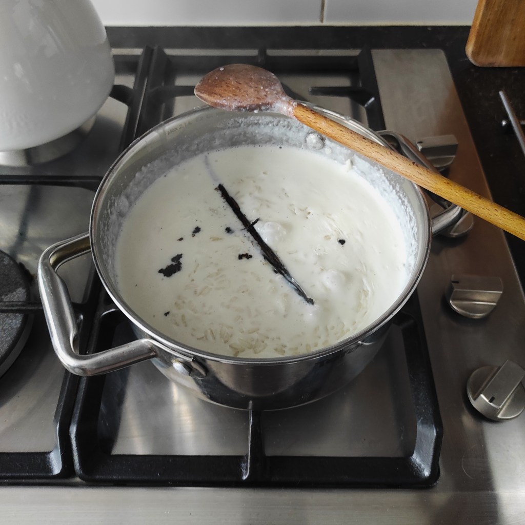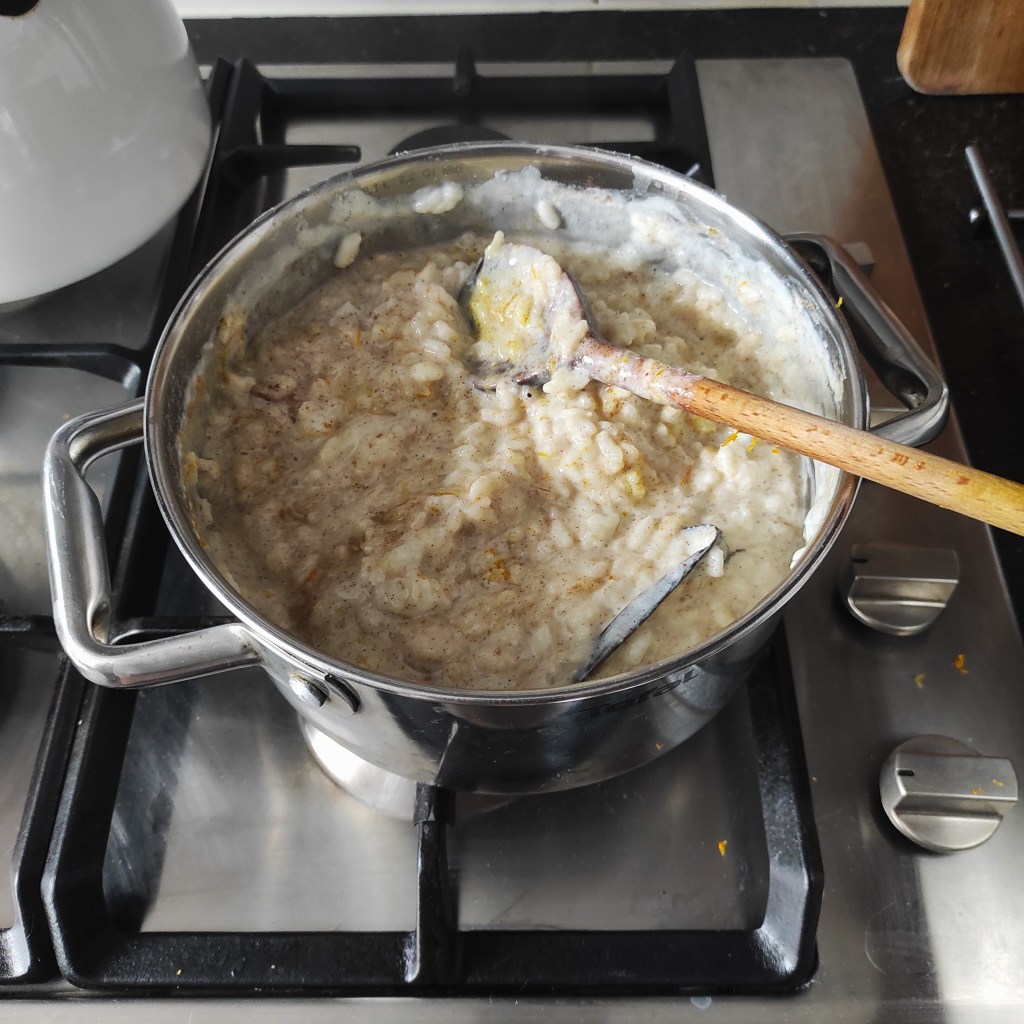 3. Po około 30 minutach gotowania ryżu, kiedy wraz z mlekiem stworzy on już dosyć gęstą masę, dodajemy do niego cynamon, a także ziarna i strąk wanilii. Gotujemy dalej, aż będzie gotowy (patrz punkt 1) i wyłączamy gaz pod garnkiem. Teraz dodajemy cukier i skórki cytrusów. Dokładnie mieszamy całość i pozostawiamy do prawie całkowitego wystygnięcia. By przyśpieszyć ten proces, możemy przełożyć masę na płaski talerz lub formę do pieczenia.