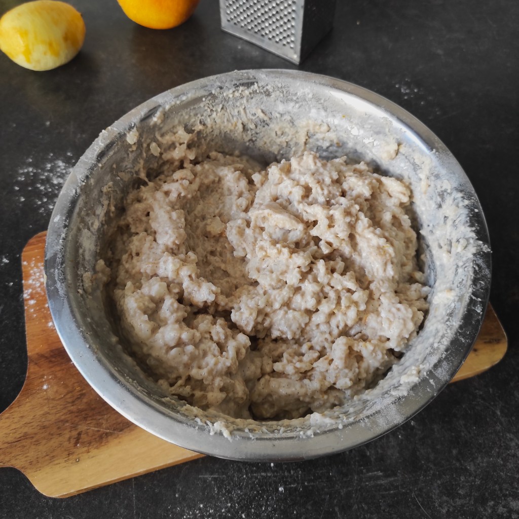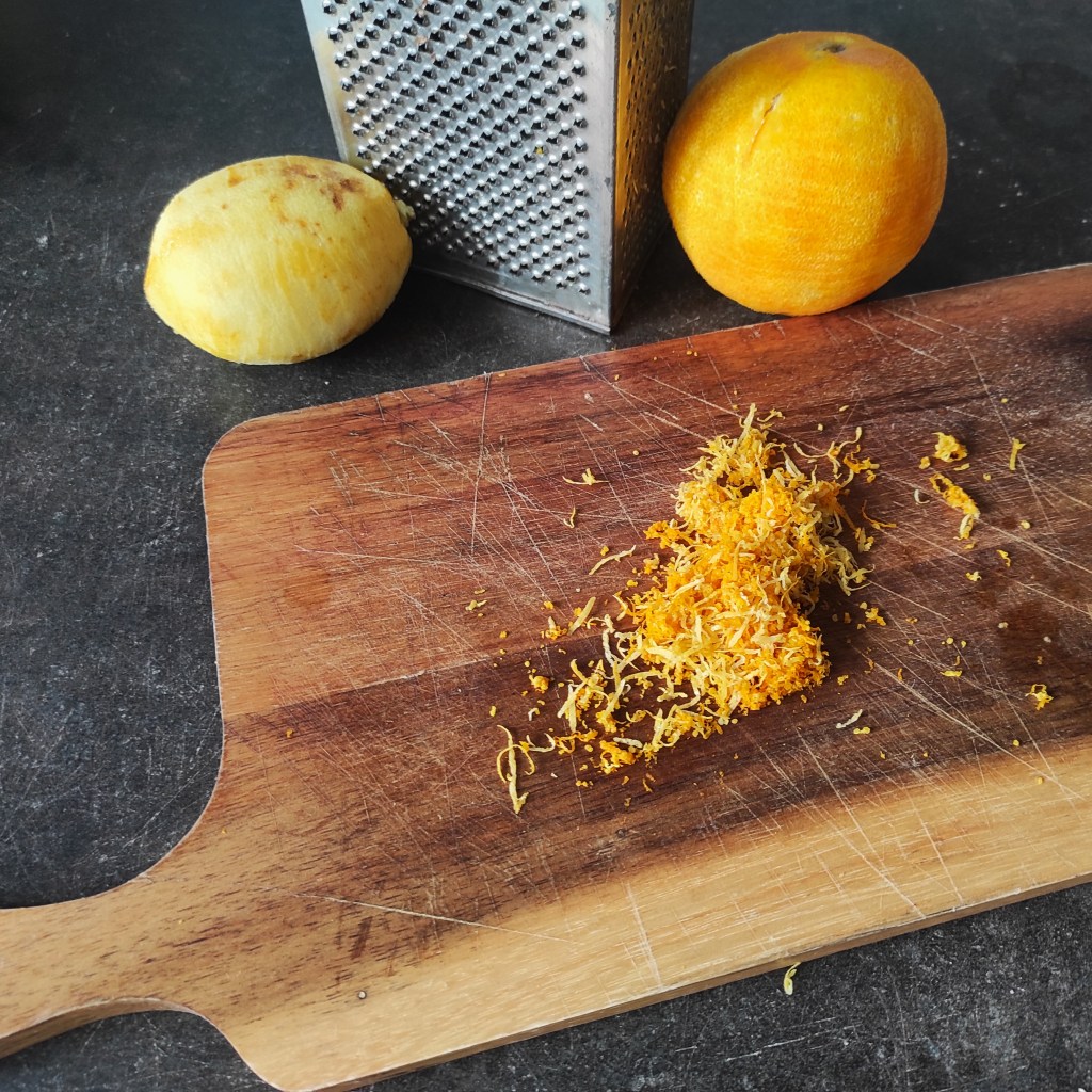 2. Kiedy ryż się gotuje, przygotowujemy pozostałe składniki. Cytrusy sparzamy i dokładnie szorujemy. Po co to robimy, zapytacie? Przecież użyliśmy ekologicznych. Cóż, dla spokoju ducha😉. W transporcie i w sklepie mogą mieć kontakt z innymi owocami, a czasami możemy także paść ofiarą oszustwa producentów. Te dodatkowe środki ostrożności nie kosztują nas w końcu aż tyle pracy. Kiedy owoce są czyste, na drobnych oczkach, ścieramy z nich całą skórkę. Pilnujemy przy tym, by nie naruszać za bardzo położonego pod nią gorzkiego albedo. Następnie wyciskamy sok z całej pomarańczy i połówki cytryny. Odmierzamy potrzebne ilości mąki, cukru, miodu, drożdży i cynamonu. Laskę wanilii rozkrawamy wzdłuż i grzbietem noża wyskrobujemy z niej nasiona. Strąka nie wyrzucamy.