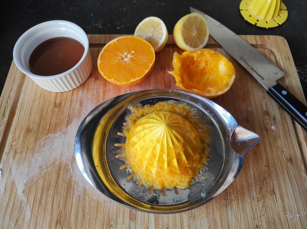 5. Kiedy ciasto wyrasta, zajmijmy się przygotowaniem miodu z cytrusami, którym polejemy gotowe crispelle. Nie jest to chyba bardzo klasyczne podejście (przepisy zwykle wzywają do użycia samego miodu), jednak dodatek soków cytrusowych na pewno ożywi całość. Podobne podejście widziałem w jednym miejscu w Katanii, tam użyto jednak skórek. No dobrze, do roboty. Wyciśnięte przez nas soki wlewamy na małą patelnię lub do niedużego garnka. Naczynie ustawiamy nad niewielkim gazem i powoli redukujemy zawartość, uważając by jej nie przypalić. Kiedy odparuje około połowy płynu, wyłączamy gaz i pozwalamy naszej mieszaninie wystygnąć. Kiedy jest już chłodna, dodajemy do niej przygotowany wcześniej miód i mieszamy do uzyskania jednolitego sosu. Gotowe!