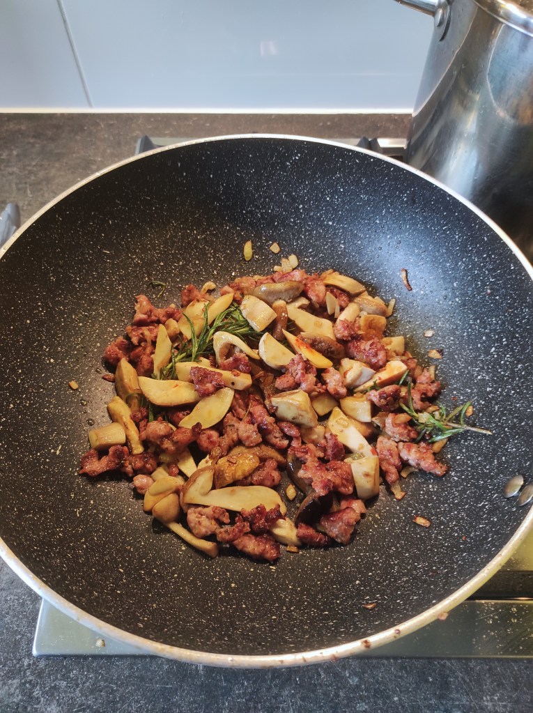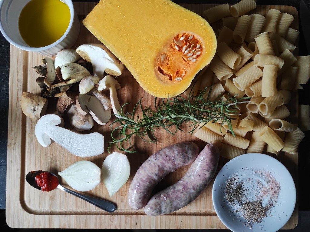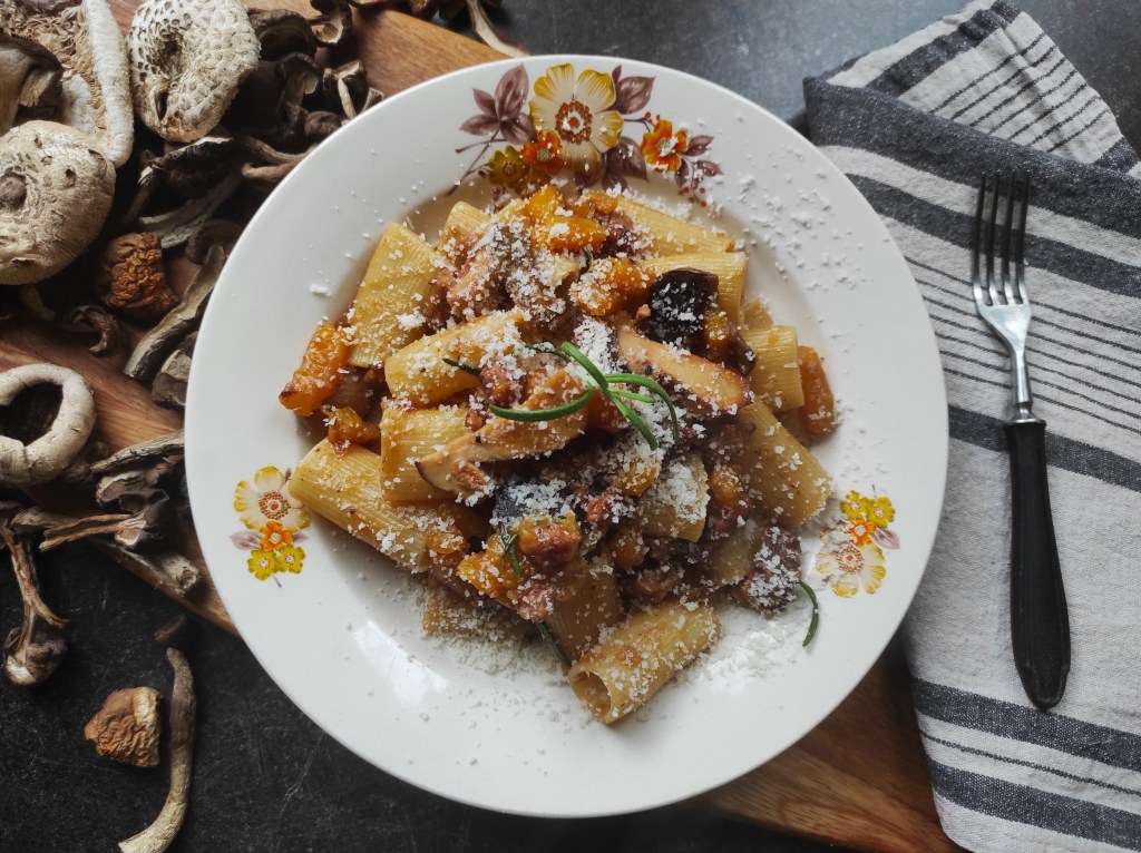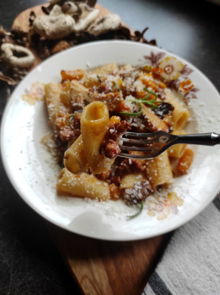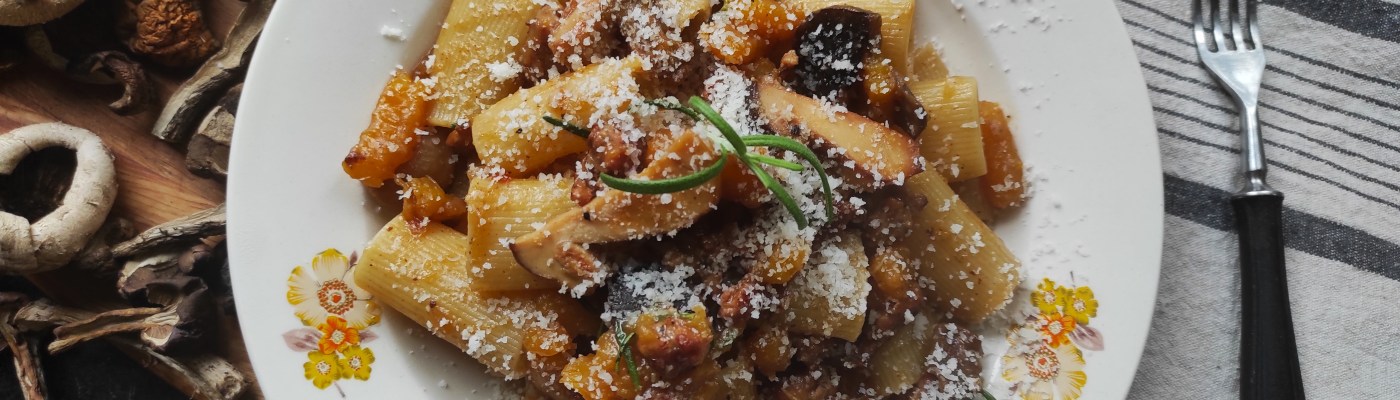 Makaron z grzybami leśnymi, surową kiełbasą, dynią i rozmarynem – Paccheri rigati con zucca, funghi, salsiccia e rosmarino