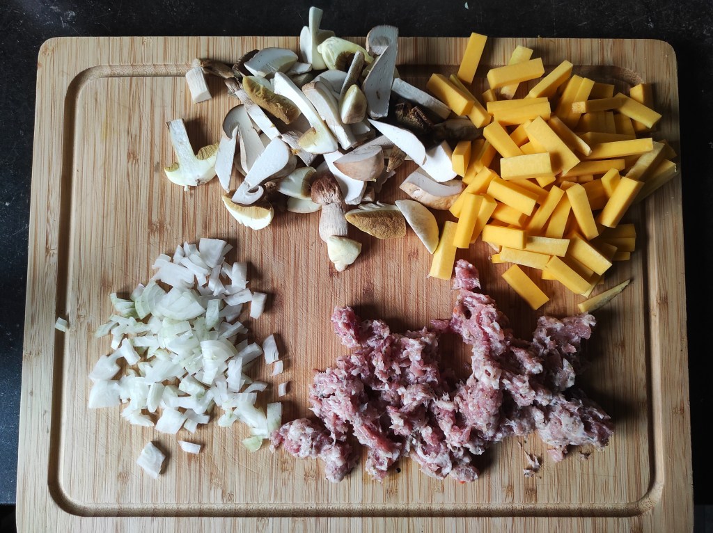 1. Zaczynamy od przygotowania składników. Grzyby, jeśli tego wymagają, czyścimy na sucho i kroimy w kostkę lub plasterki. Kawałki nie powinny być za duże ani za małe – muszą zachować nieco swojej struktury i dobrze współgrać z użytym makaronem. Kiełbasę obieramy z flaka i rozdrabniamy przy pomocy widelca lub dłoni. Dynię obieramy ze skórki i kroimy w kostkę lub słupki. Ich wielkość uzależniona jest od tego, czy chcemy by warzywo kompletnie się rozpadło w sosie. Ja preferuję słupki o długości 3-4 cm, grube na około 6-7 mm, które częściowo zachowają kształt i dobrze połączą się z makaronem typu rurki. Cebulę kroimy w niewielką kostkę.