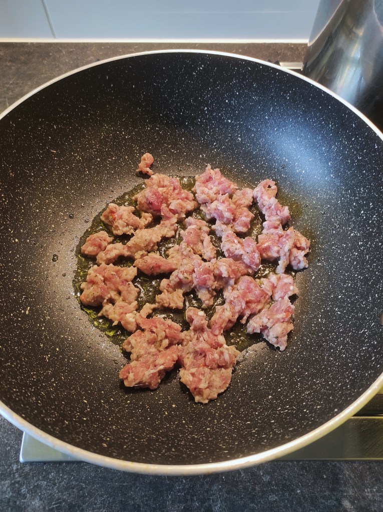 3. Około 10 minut przed zagotowaniem wody na makron zaczynamy przygotowywać sos. Do tego zadania będziemy potrzebować głębokiej patelni, rondla lub płaskiego garnka, na tyle dużego by pomieścił wszystkie składniki sosu i ugotowany makaron oraz pozwolił na ich łatwe wymieszanie. Do środka naczynia nalewamy 3-4 łyżki oliwy i ustawiamy je na dużym gazie. Kiedy tłuszcz jest już gorący, wrzucamy kiełbasę starając się nie kupić kawałków na sobie (jeśli wszystko zrobiliśmy dobrze, salsiccia nie powinna puścić soku). Nie mieszamy do czasu, aż nabierze ładnego złoto-brązowego koloru z jednej strony. Dopiero teraz w ruch idzie łyżka lub łopatka. Przewracamy kawałki kiełbasy, jednocześnie rozkruszając je na mniejsze części.  Pozwalamy jej obsmażyć się z pozostałych stron. Kiedy kiełbasa przestanie być surowa i nabierze ładnej barwy, dorzucamy cebulę. Smażymy krótko, aż warzywo się zeszkli, często mieszając. Teraz dorzucamy grzyby, rozmaryn, chili i dużą szczyptę świeżo zmielonego czarnego pieprzu. Z grzybami postępujemy podobnie jak z kiełbasą. Nie „męczymy” ich od razu, a pozwalamy nabrać koloru z jednej strony. Dopiero wtedy mieszamy. Kiedy nabiorą lekko złotej barwy, zmniejszamy gaz na średni i dodajemy dynię. Moment ten powinien mniej więcej zgrać się czasowo z wrzuceniem makaronu do gotującej się wody (patrz punkt wyżej). Dynię smażymy chwilę, a następnie dodajemy odrobię wody spod makaronu i dużą szczyptę soli, po czym przykrywamy patelnię pokrywką. Sos gotujemy w ten sposób przez kolejne 7-10 minut, co jakiś czas mieszając i ewentualnie dodając kolejne niewielkie porcje wody, jeśli całość stanie się zbyt sucha. Finalnie dynia powinna kompletnie zmięknąć, ale w większej części pozostać w kawałkach na jakie ją pokroiliśmy. Na powierzchni tych ostatnich powinniśmy też zobaczyć ślady lekkiej karmelizacji.